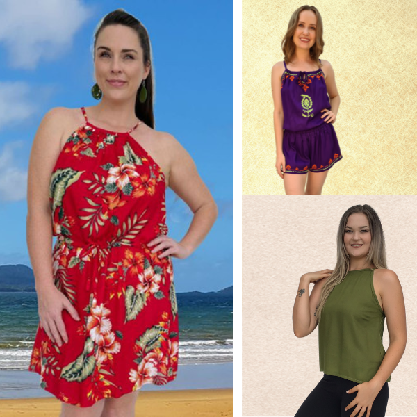 We have women's dresses tops skirts and jumpsuits, men's shirts and pants, kids clothing too. Our clothing is designed in Australia and made in Indonesia.